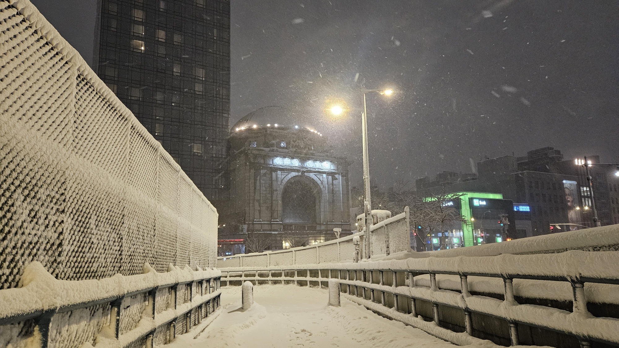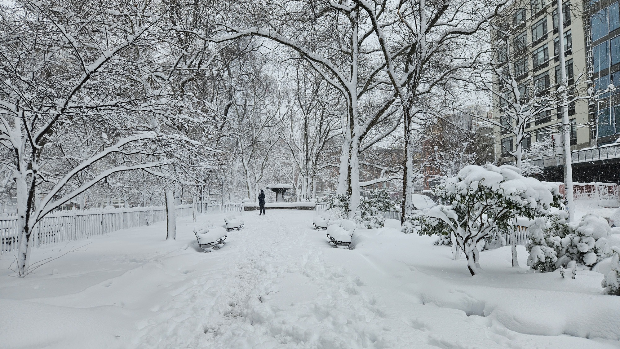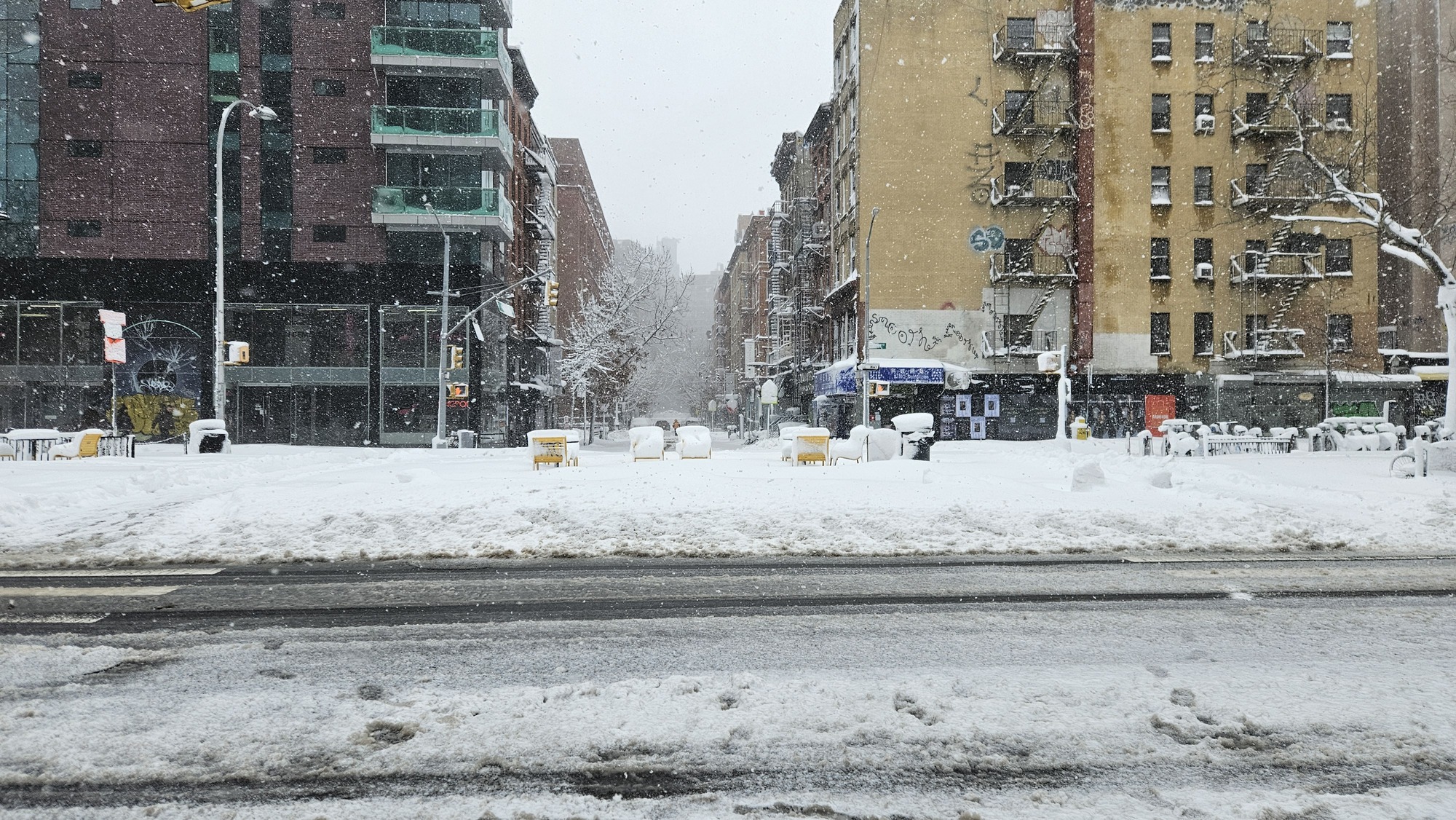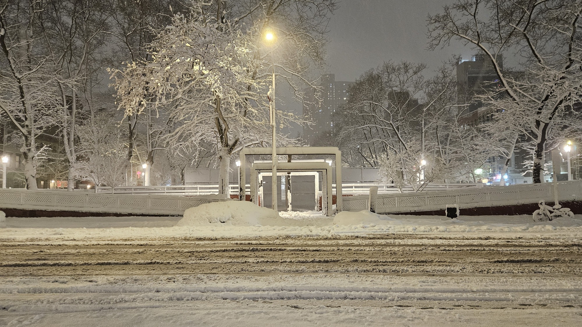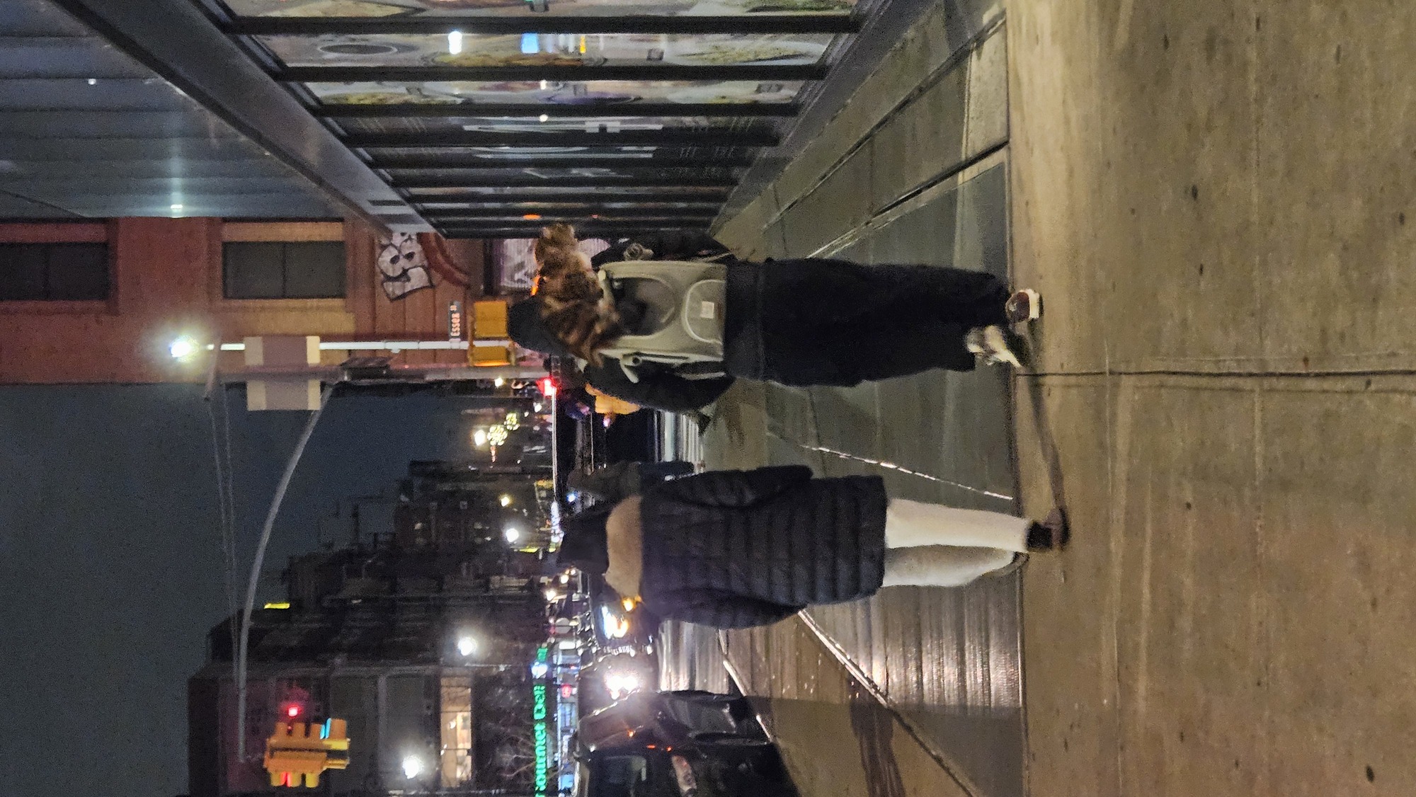 Walking to the 7 this morning to get to work. Corner of Roosevelt and 111th. They are doing construction on the subway. Me and a lady are waiting to cross the street.
